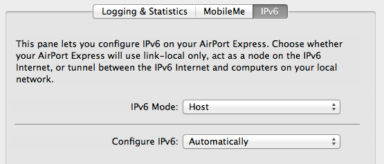 It turns out that iTunes on Mac OS X now finds its AirPlay clients through IPv6, but that the AirPort Express doesn’t use IPv6 by default. The solution is to go to the AirPort Utility, go to Advanced, IPv6 and set IPv6 Mode to “Host”. Do this, restart iTunes, and it should work just fine from all of your Apple devices.Conclusion