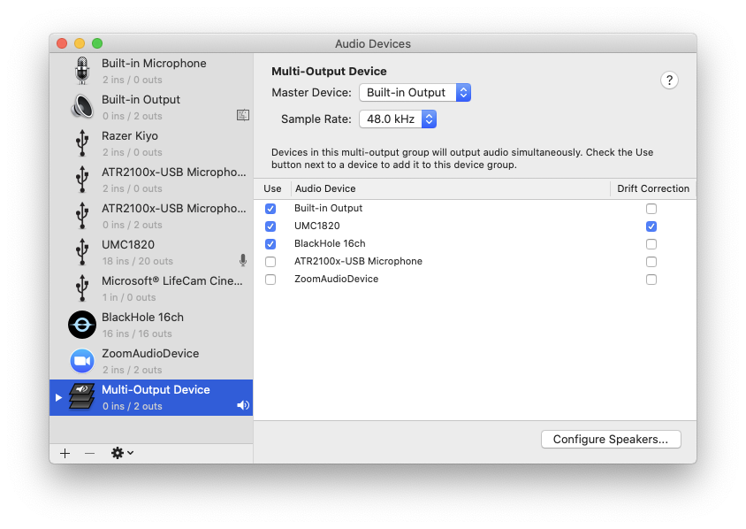- In the Multi-Output Device, enable the devices, one at a time. In general, I think the order that works is to first enable the Built-In Output, then your hardware audio interfaces, then internal software mixers like BlackHole/Soundflower or ZoomAudioDevice.